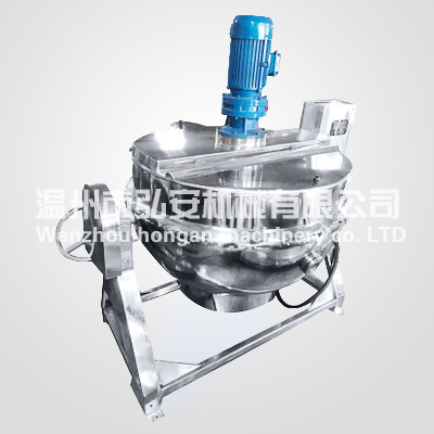 可倾式夹层锅由锅体、支架、蜗轮、蜗杆等部件组成,锅体可作180° 以内的转动,本设备为敞口式浓缩,主要用于制药、食品、化工、轻 工等行业对料液的煎煮和浓缩,该设备与物料接触部分为不锈钢SUS304,具有较好的耐腐蚀性能,经久耐用,符合GMP要求,同时 亦、可根据用户要求,可增加搅拌装置。